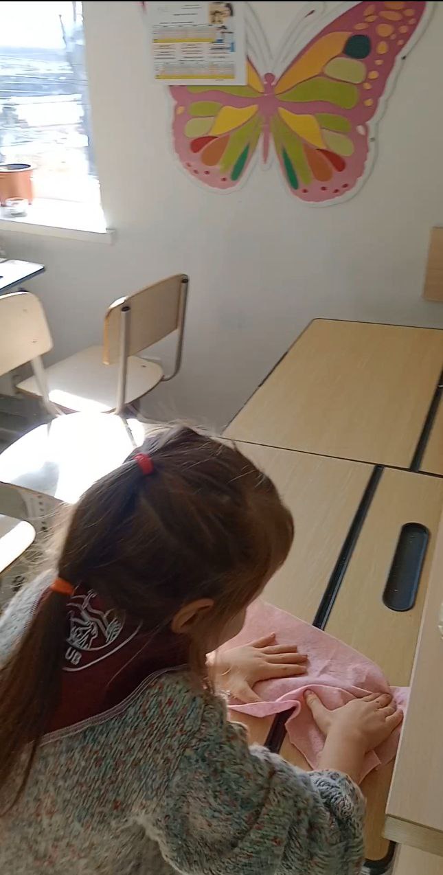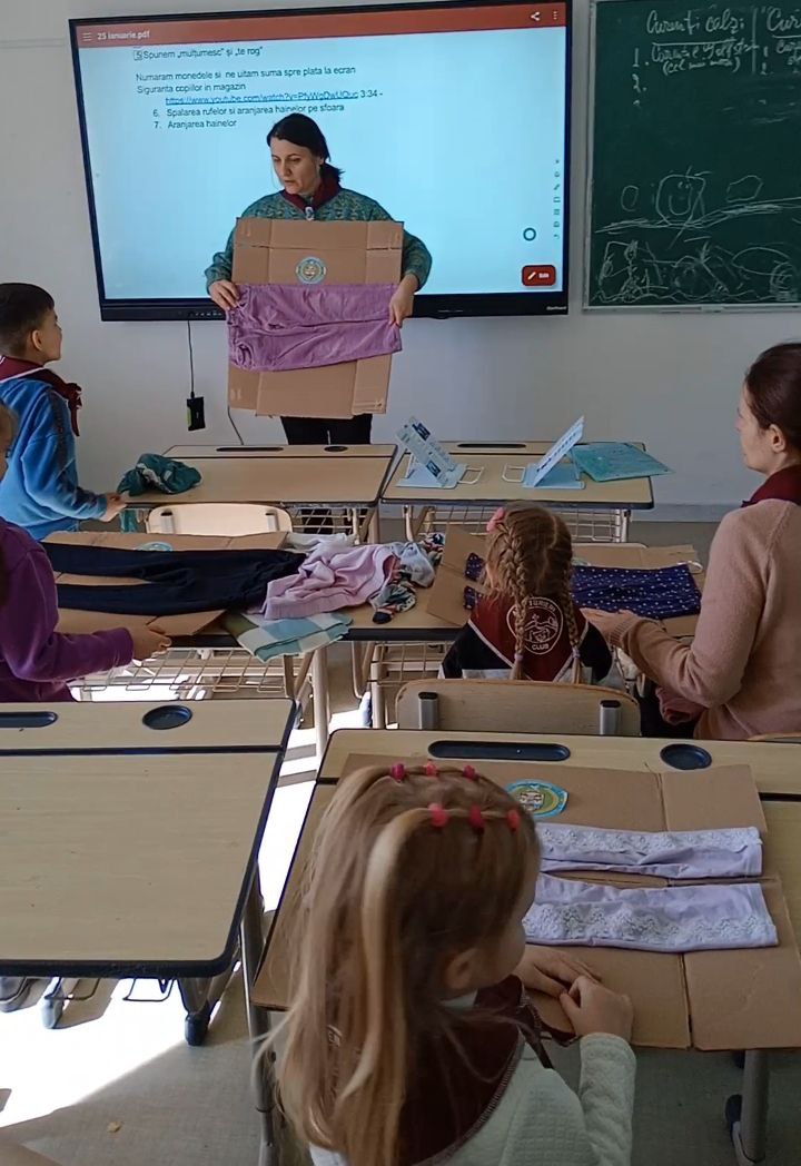 Un moment special a fost demonstrarea unui instrument realizat din carton, care îi ajută pe copii să împăturească rapid și frumos hăinuțele (maletuțe, pantaloni), astfel încât să rămână neschifonate și bine așezate pe raft. Bucuria lor când au reușit singuri a fost de nedescris!